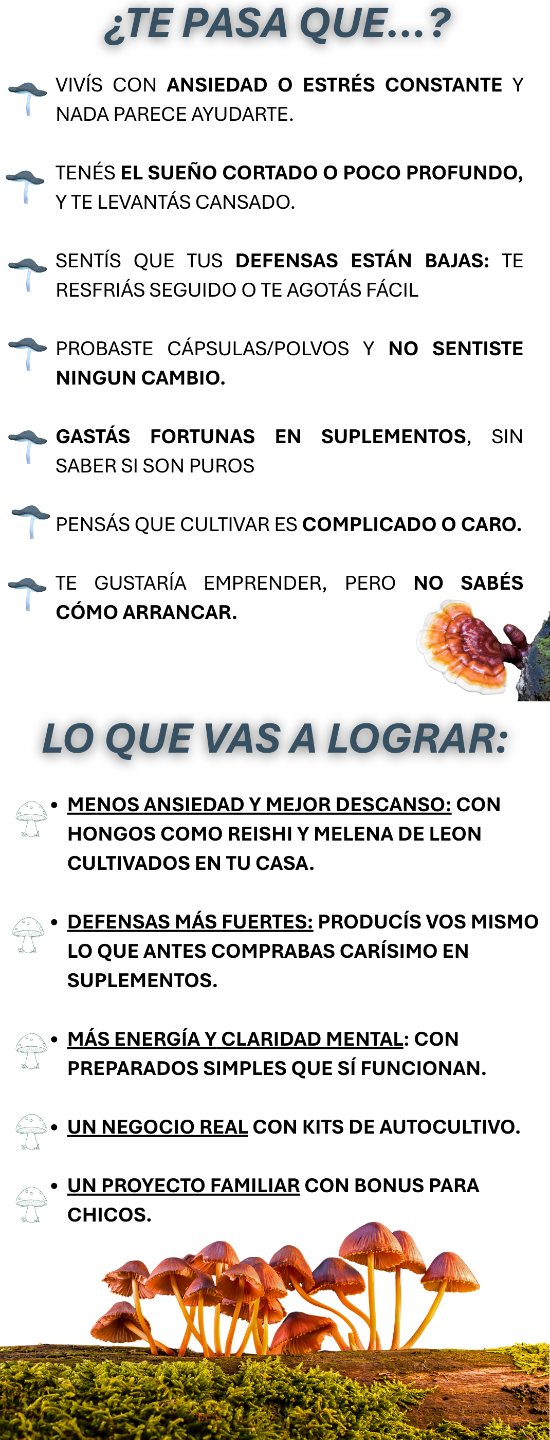 Sí. Incluimos una guía completa para producir y vender kits de autocultivo de hongos medicinales, un mercado que hoy está en crecimiento constante en Argentina.